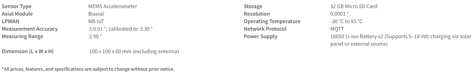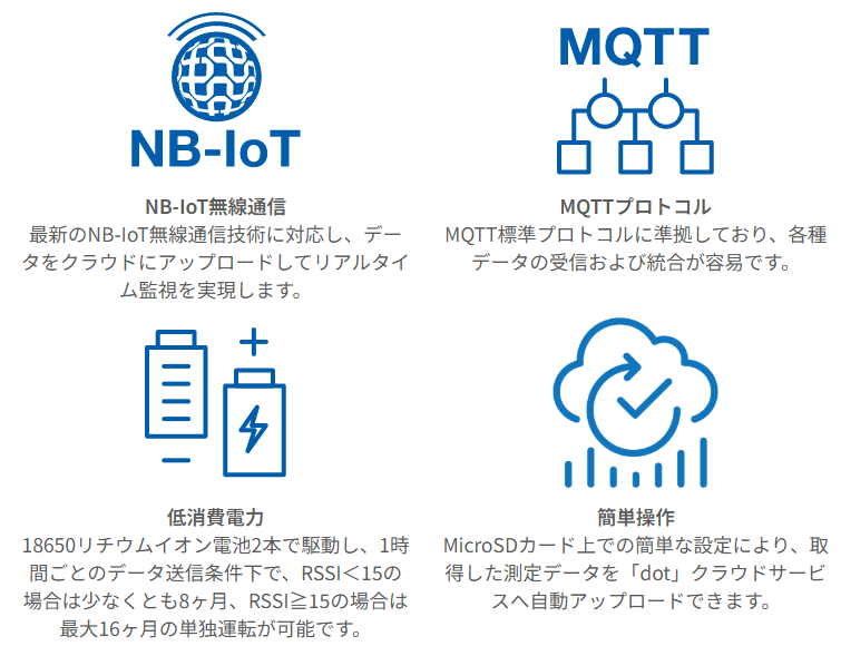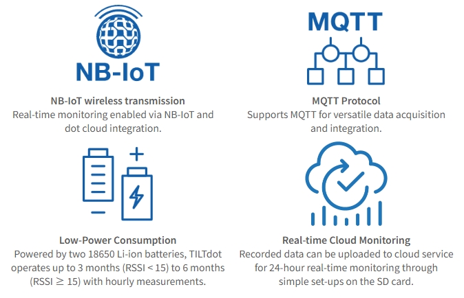 TILTdotは、NB-IoT無線通信機能を搭載した電子式の傾斜計で、2軸の傾斜角度と温度の測定が可能です。堅牢で防水性の高い筐体設計により、過酷な環境下でも正確かつ連続的なデータ取得を実現します。電力効率に優れた18650リチウムイオン充電池を2本使用することで、長期的な測定と即時のデータアップロードを可能にします。さらに、内蔵の32GB Micro SDカードにより、100万件以上の記録データを保存でき、dotクラウドサービスへのバックアップにも対応しています。都市土木工事、河川水利工事、橋梁工事、ならびに建築物や構造物、擁壁などの傾斜安全監視に最適なソリューションです。