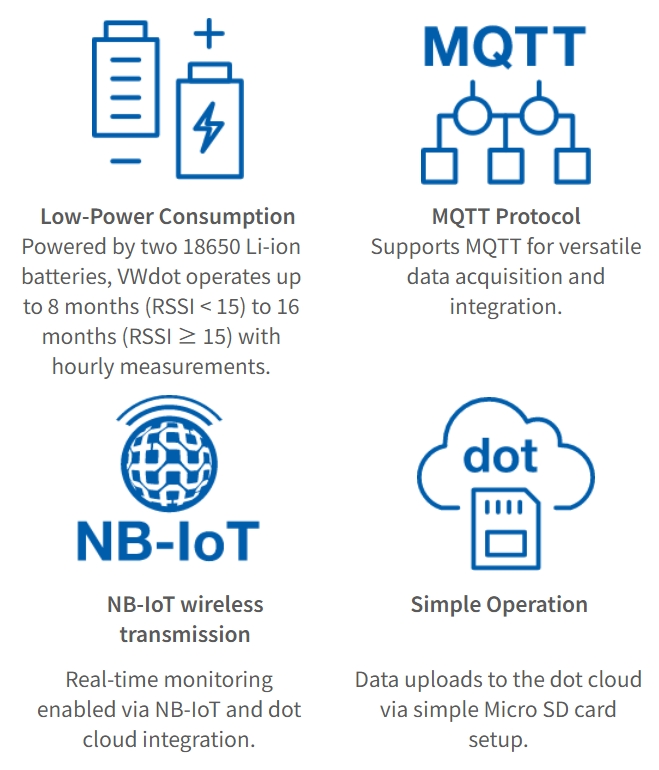 VWdot・振動弦式データロガーは、NB-IoT無線通信技術を採用し、岩土工学分野のニーズに応えるために設計された製品です。土木工事、水利工事、建築分野などにおける自動化安全監視に最適な信頼性の高いソリューションです。