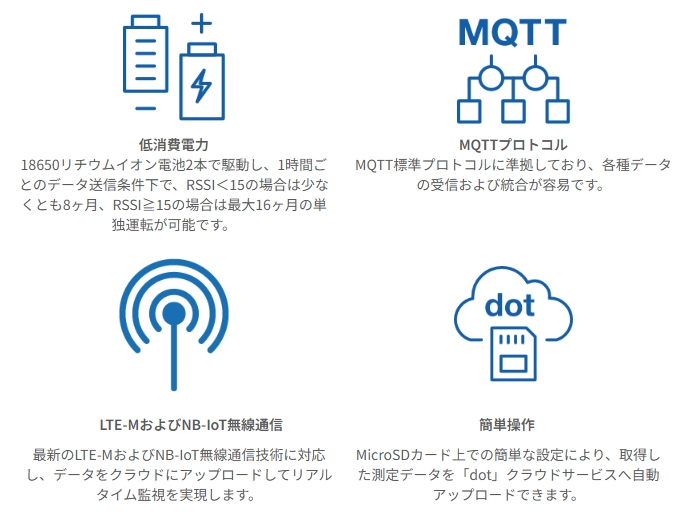 VWdot・振動弦式データロガーは、LTE-MおよびNB-IoT無線通信技術を採用し、岩土工学分野のニーズに応えるために設計された製品です。土木工事、水利工事、建築分野などにおける自動化安全監視に最適な信頼性の高いソリューションです。