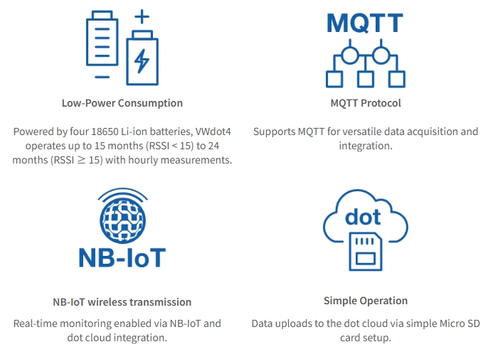VWdot4・振動弦式データロガーは、NB-IoT無線通信技術を採用し、岩土工学分野のニーズに応えるために設計された製品です。土木工事、水利工事、建築分野における自動化安全監視に最適な信頼性の高いソリューションです。